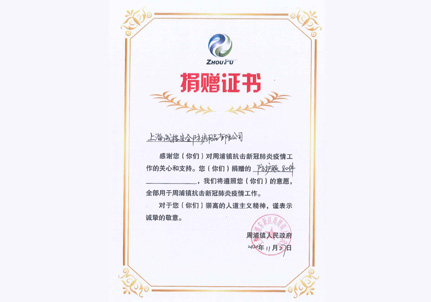 捐贈(zèng)證書 周浦鎮(zhèn)人民鎮(zhèn)府