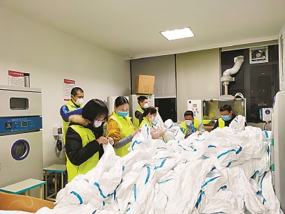 走廊里疊衣服的大姐說:“網(wǎng)上的視頻里,醫(yī)生戴著口罩,穿著防護服在病房走進走出,只能看到一雙眼睛,看到那眼神我就想哭。”說著,她低頭仔細把衣服折好,“前線那么辛苦,我們就多做些力所能及的。”