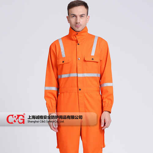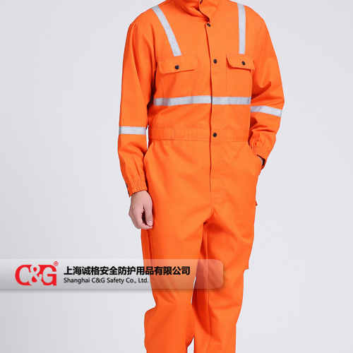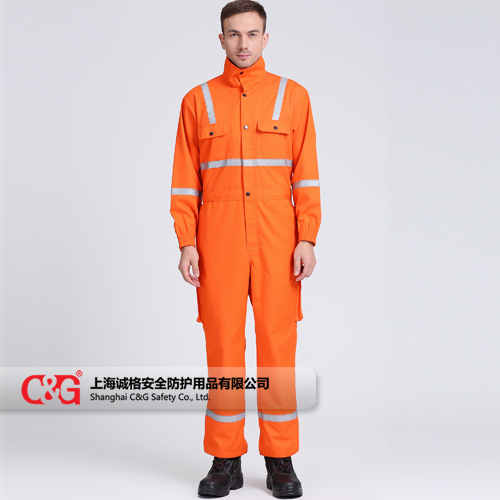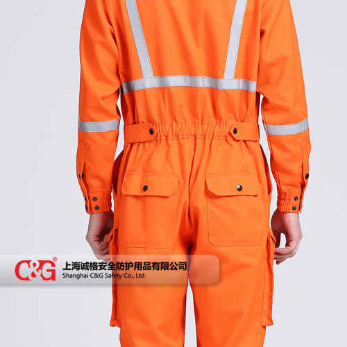 產品描述:200g/㎡,阻燃防護服采用杜邦™Nomex® IIIA面料制作。立領設計,兩個胸帶皆為雙線縫制,兩個后褲袋及斜插袋,前襟銅拉鏈加內置四合扣封閉,橡皮帶收腰,采用配色阻燃線雙線埋夾縫制。